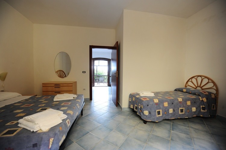 Sistemazione: 25 Cottage per 2/3 persone, costruiti totalmente in muratura, situati nella zona superiore del villaggio, a 100/150 m ca dalla piscina, che si raggiunge tramite una scalinata nel verde. Sono indicati ad una clientela giovane e dinamica (non ammessi bambini di età inferiore a 5 anni), con spazi essenziali, ingresso con porta finestra, letto matrimoniale e letto singolo, aria condizionata, minifrigo e servizi. 80 Camere Mono per 2/4 persone, situate vicino ai servizi principali, si presentano come strutture indipendenti (zona piscina) o come strutture distribuite a schiera su 3 livelli (zona ristorante/reception), dispongono di camera con letto matrimoniale e letto singolo o a castello, aria condizionata, tv, mini frigo, veranda attrezzata, servizi. 30 Camere Bilo per 4 persone (45 mq ca), situate vicino ai servizi principali, in strutture su due livelli, con patio se al piano terra o veranda se al primo piano, entrambi attrezzati, costituiti da camera matrimoniale e camera con 2 letti singoli, tv, minifrigo, aria condizionata e servizi (possibilità su richiesta di 5° letto in camera matrimoniale e 6° letto nella cameretta). Disponibili sistemazioni vista mare in tutte le tipologie.